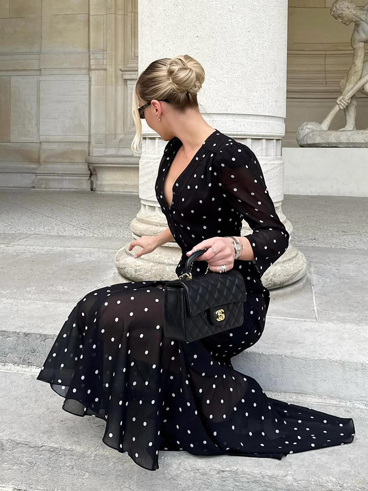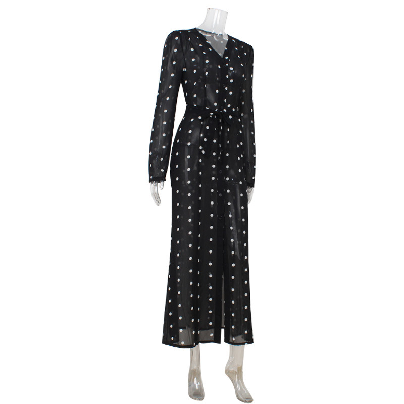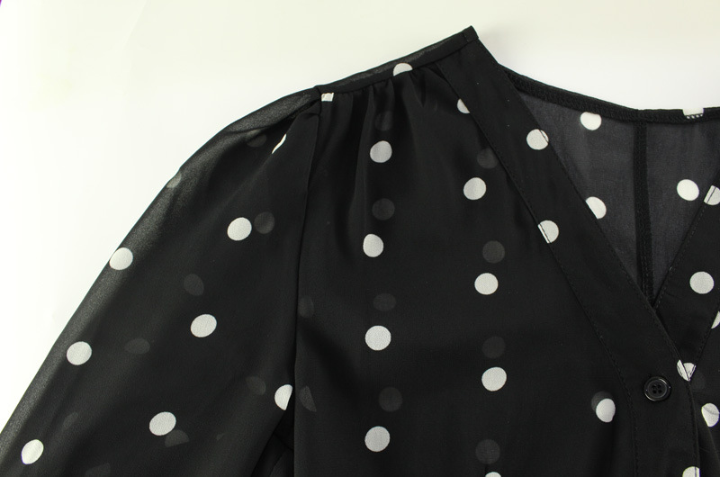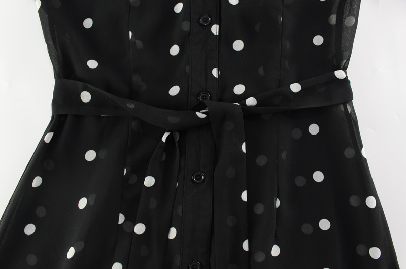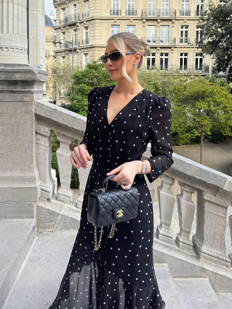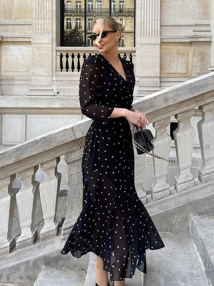 Elegant Mid-Length V-Neck Polka-Dot Waist-Cinched Dress