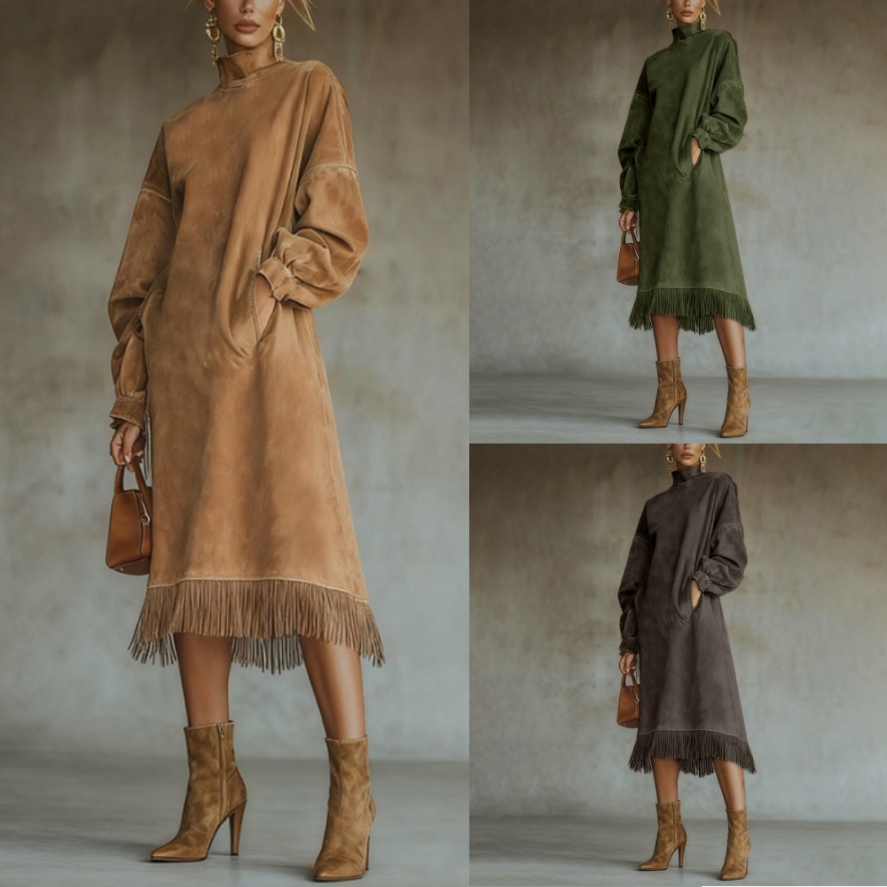 High-neck Suede-velvet Retro Loose-fit Long Dress With Pockets And Fringed Long Sleeves