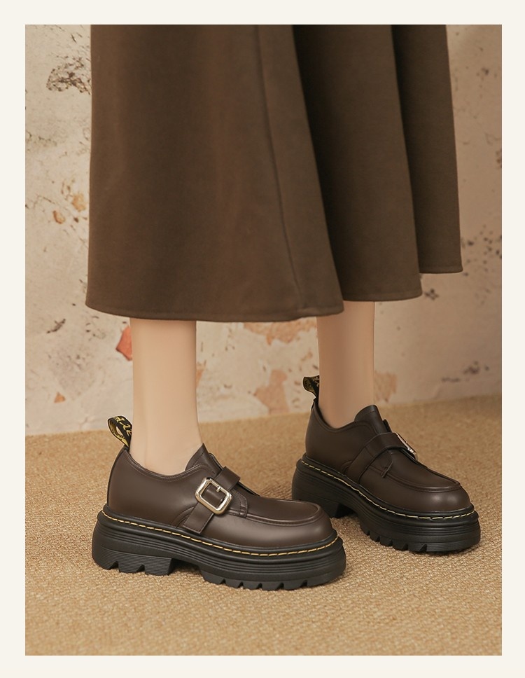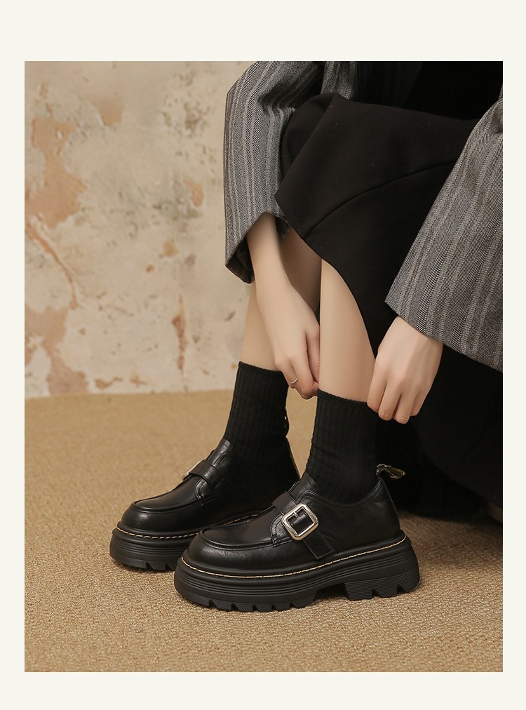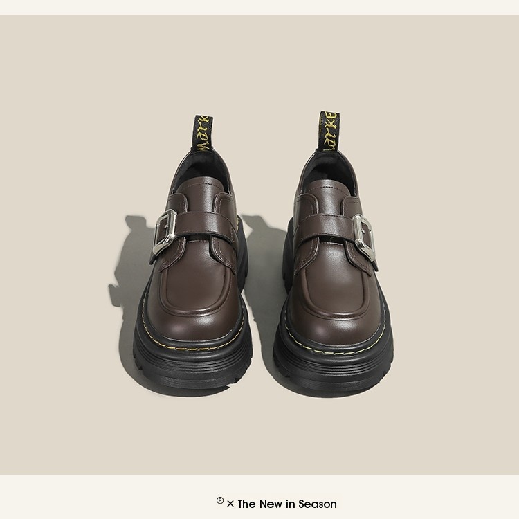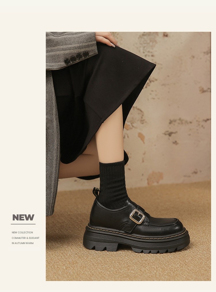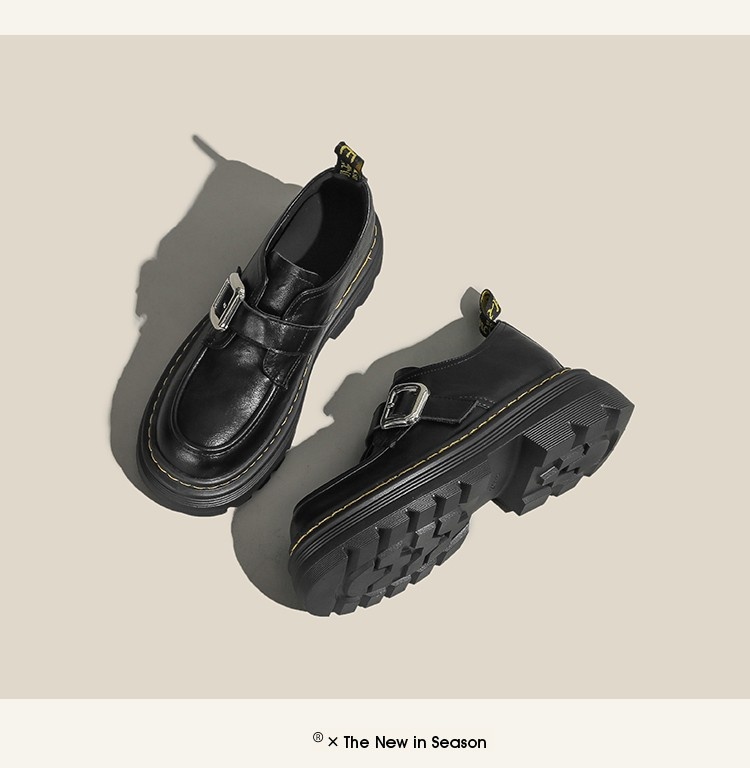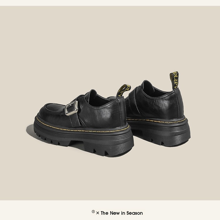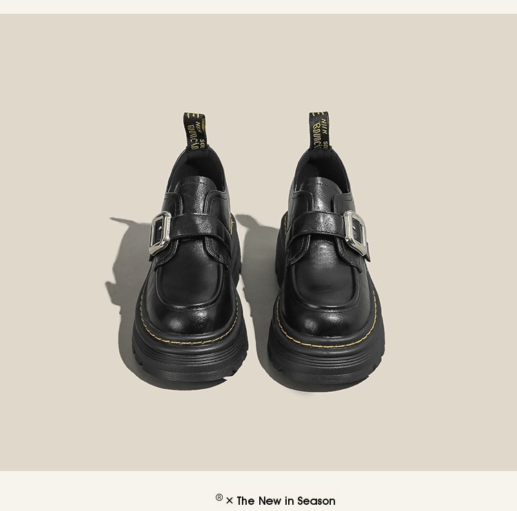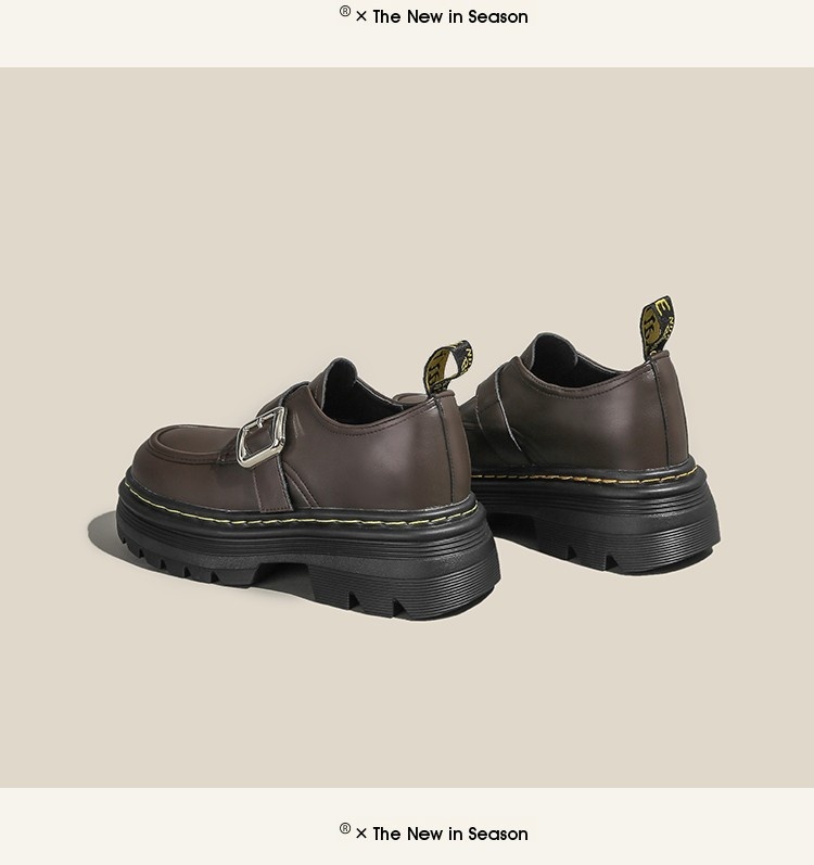 Trendy elements: Patchwork, chunky heel, belt buckle, built-in height lift