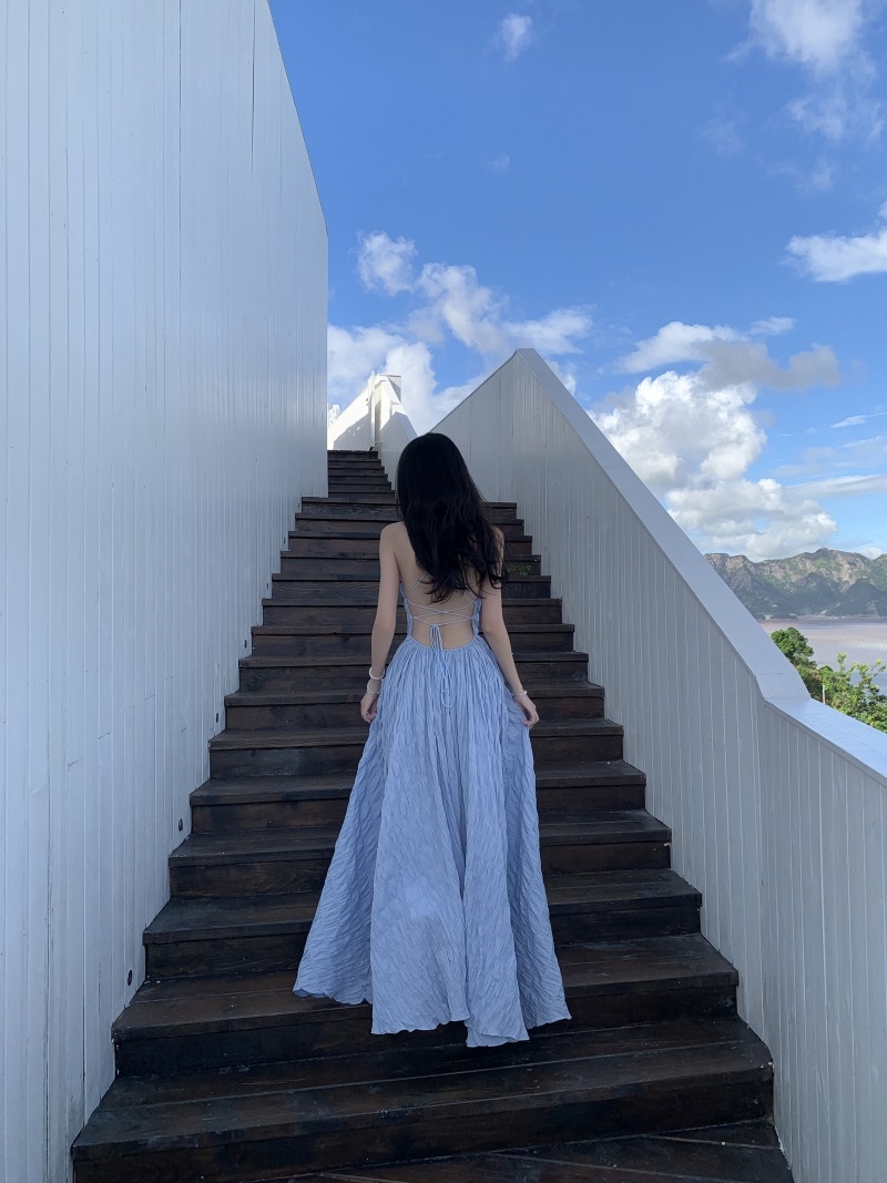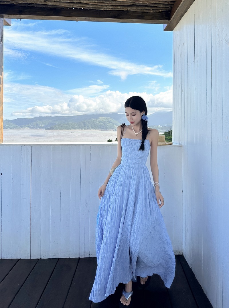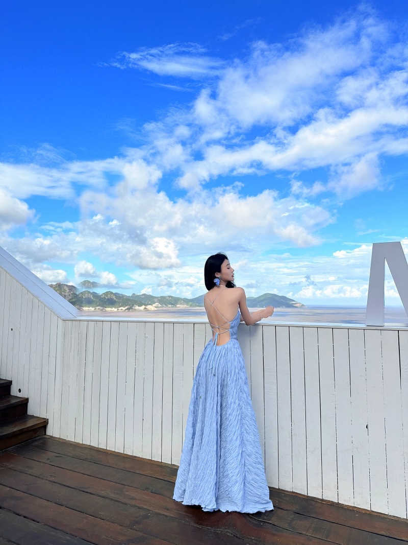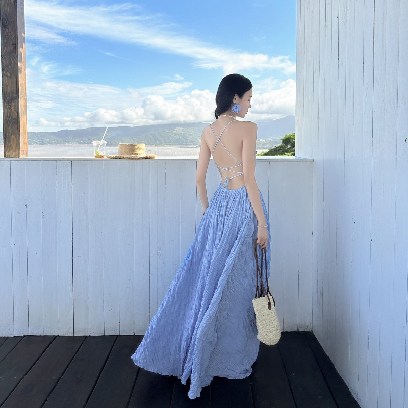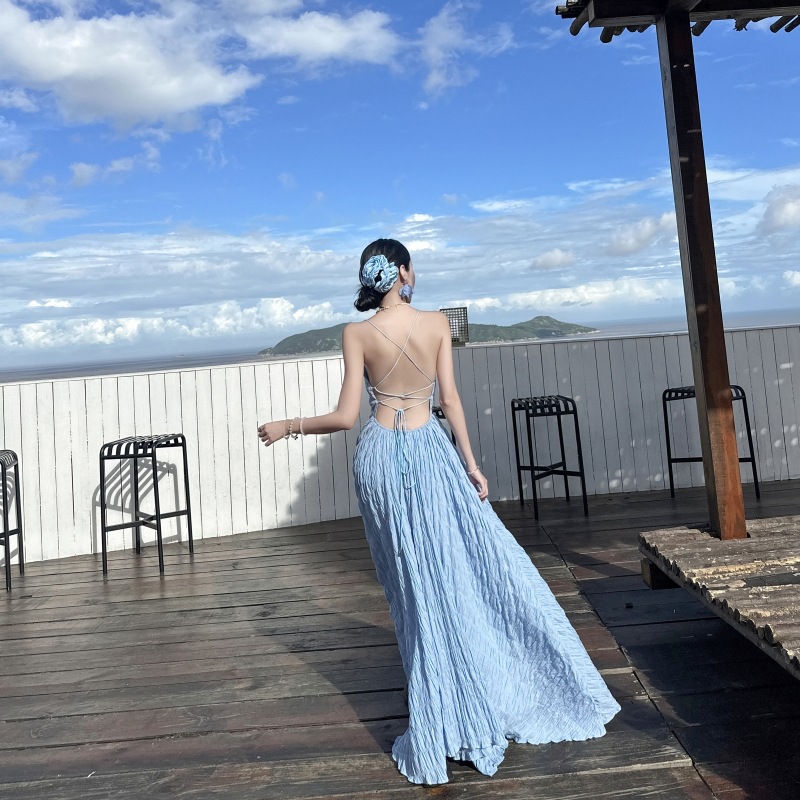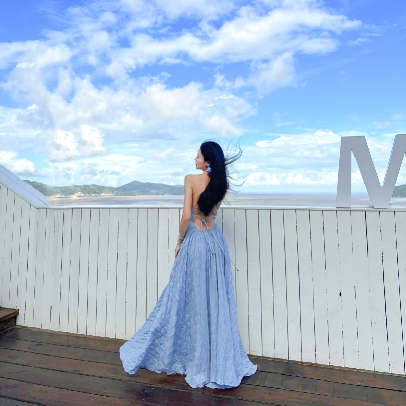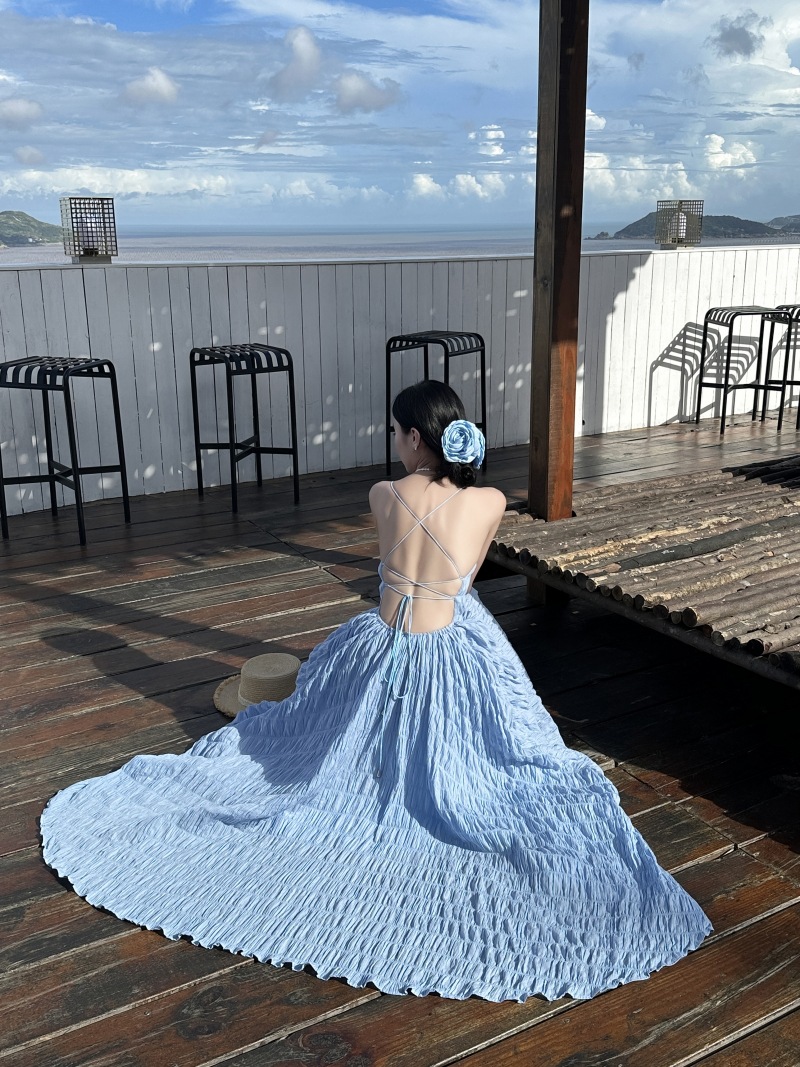 Summer Seaside Waves A Blue Sheer Vacation-style Backless Dress